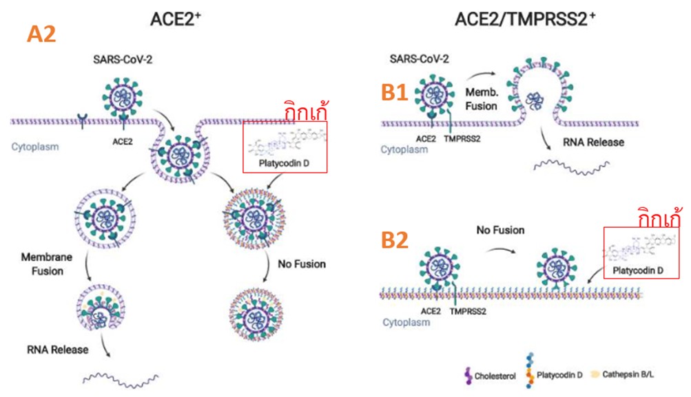 สุดท้ายภาพ B2 คือ กิกเก้ที่เคลือบบนเยื่อบุเซลล์ของเรา กิกเก้ไปล็อคประตูทางเข้าของไวรัสไว้ ทำให้ไวรัสเข้าสู่เซลล์ในร่างกายเราไม่ได้ Tai Young Kim et al.(2021)