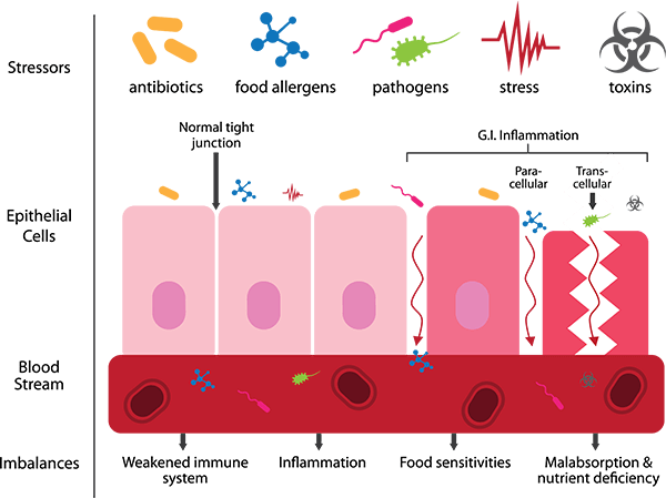 Normally, the intestinal endothelial cells are aligned together in an orderly manner called "Tight Junctions" that control the passage of substances and prevent toxins, pathogens, or foreign matter from entering the intestinal endothelial cells directly into the bloodstream but when the intestinal endothelial cells become inflamed (Inflammation) and damage to tight junctions, causing gaps between intestinal endothelial cells, thus losing the ability to control the passage of substances such as toxins, allergens and pathogens can therefore escape through these gaps directly into the bloodstream. The increase in these gaps is called "Leaky Gut Syndrome" or "Leaky Gut Syndrome", the body has to accelerate the immune system to resist these foreign things. Until causing problems with chronic inflammation repeatedly and becoming a subsequent illness. Leaky gut is caused by an imbalance of good bacteria in the gut.